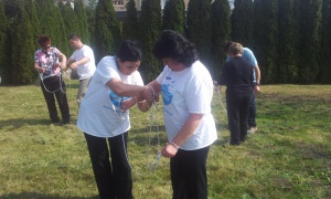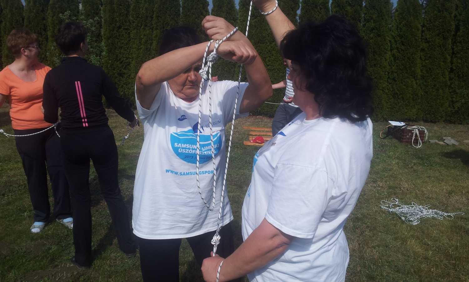 A csapaton belül a résztvevők párban állnak, a karjukra egy keresztben átfűzött kötelet kapnak. Ezt a kötelet úgy kell két különálló kötéllé szabadítani, hogy a csomót nem bontják meg. A csapat többi része segít kitalálni a megoldást. Ez egy logikára és együttműködésre ösztönző feladat.