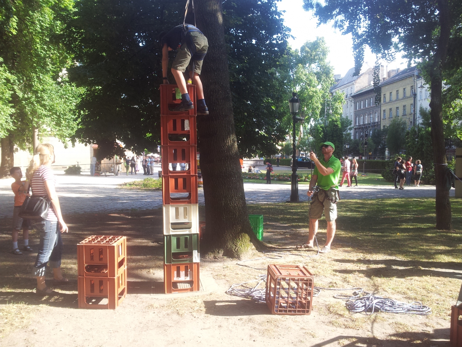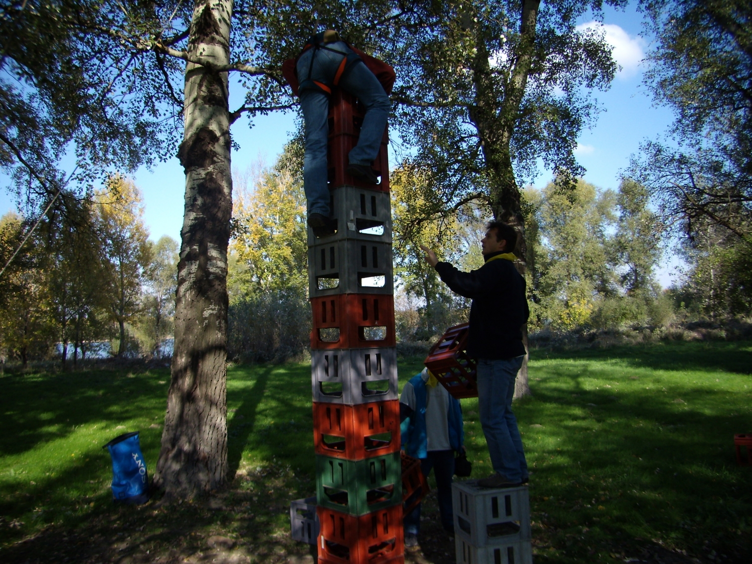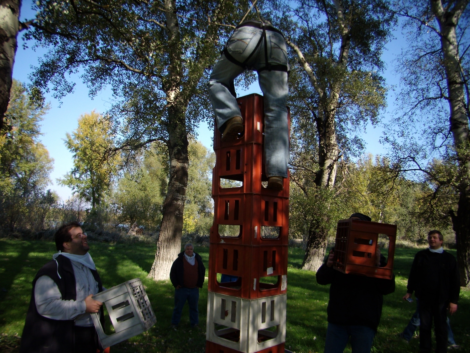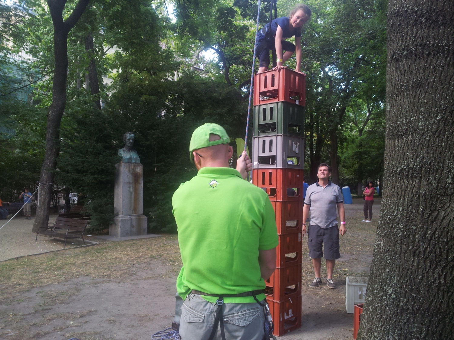 Sörös rekeszekből a bátor vállalkozónak minél magasabb tornyot kell építeni maga alatt úgy, hogy közben a rekeszek tetején egyensúlyoz. A csapat többi tagjai biztathatják, segítheti a mászót, adogatják a rekeszeket, esetleg a biztosításban is részt vehetnek. Természetesen a mászót, alpintechnikai szakember a megfelelő felszerelés biztosítja.