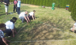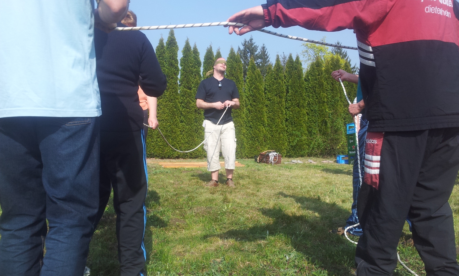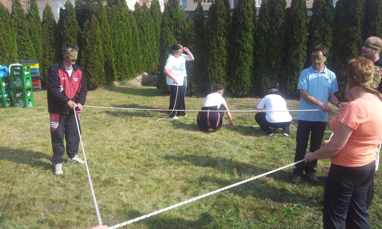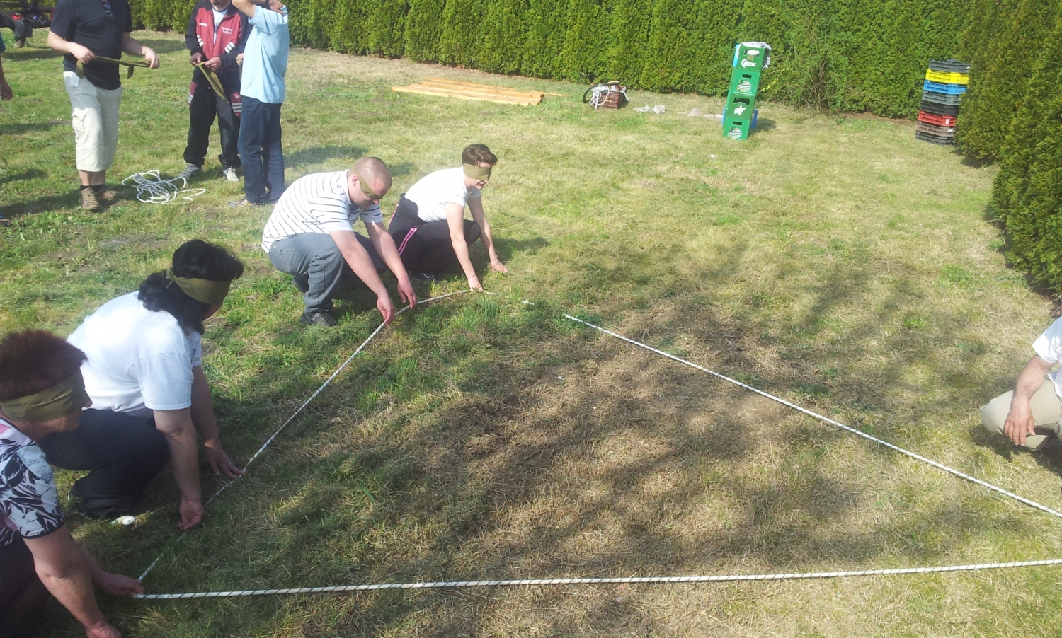A játékosoknak bekötött szemmel kell egy egyenlő szárú háromszöget alkotniuk, az általunk adott kötélből, miközben mindenki fogja azt.