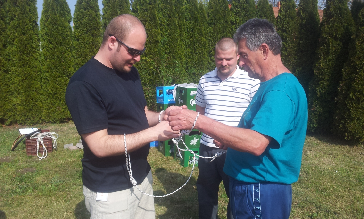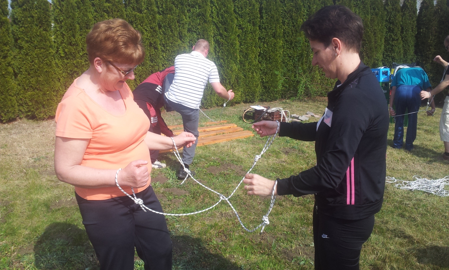 A csapaton belül a résztvevők párban állnak, a karjukra egy keresztben átfűzött kötelet kapnak. Ezt a kötelet úgy kell két különálló kötéllé szabadítani, hogy a csomót nem bontják meg. A csapat többi része segít kitalálni a megoldást. Ez egy logikára és együttműködésre ösztönző feladat.
