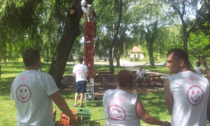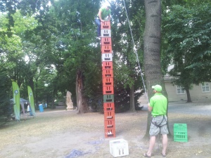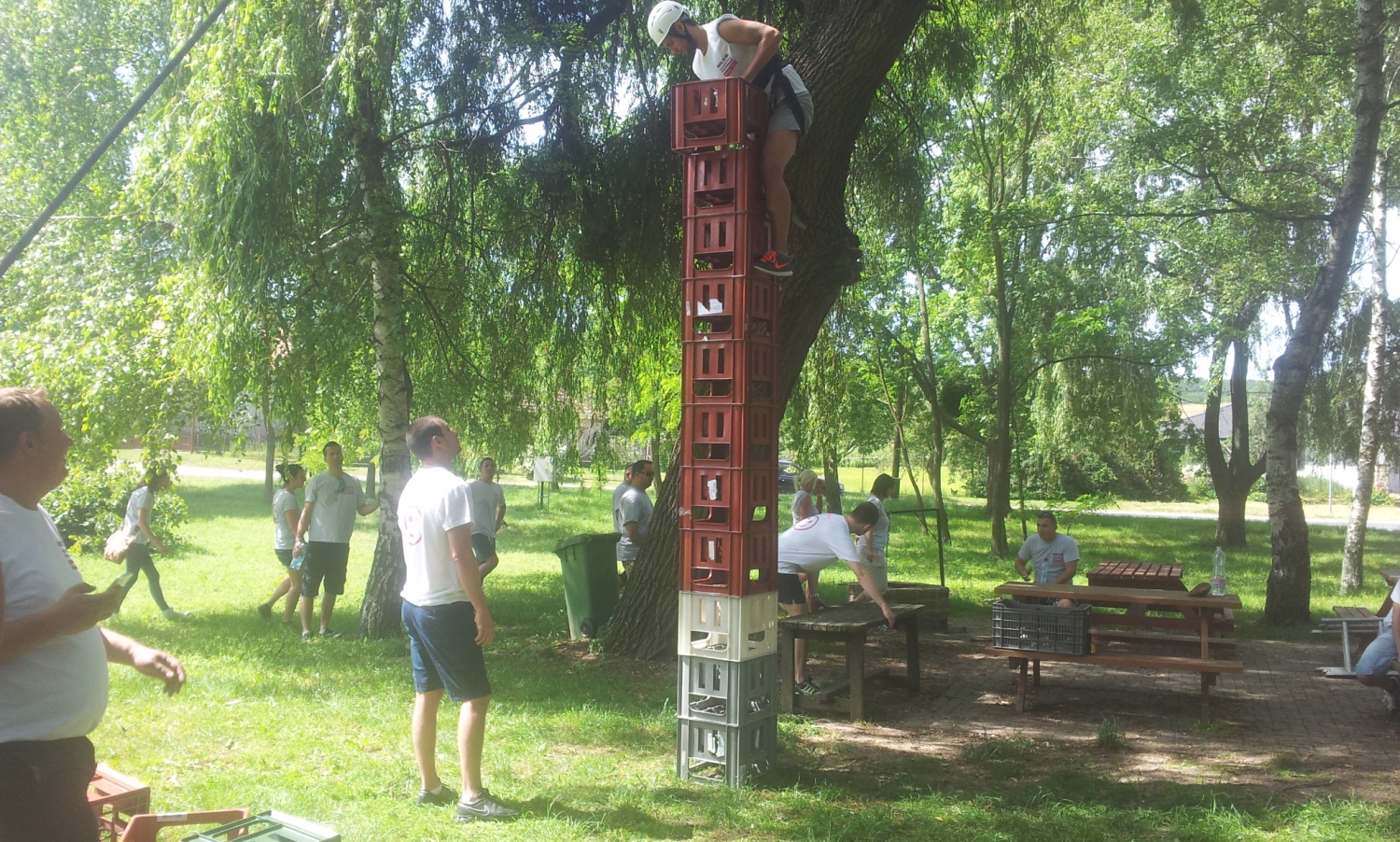 Sörös rekeszekből a bátor vállalkozónak minél magasabb tornyot kell építeni maga alatt úgy, hogy közben a rekeszek tetején egyensúlyoz. A csapat többi tagjai biztathatják, segítheti a mászót, adogatják a rekeszeket, esetleg a biztosításban is részt vehetnek. Természetesen a mászót, alpintechnikai szakember a megfelelő felszerelés biztosítja.