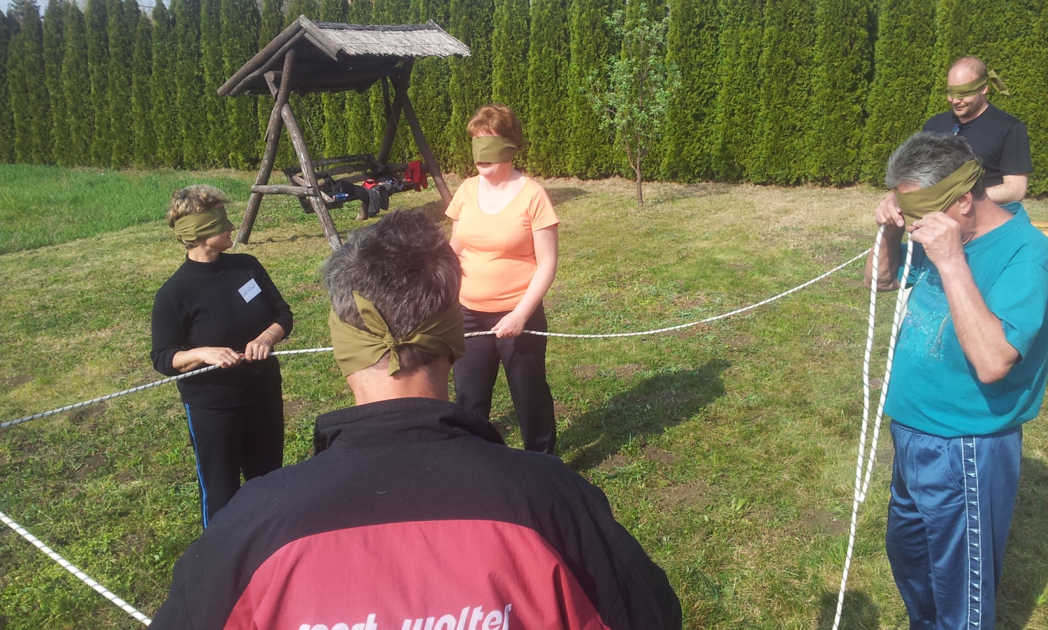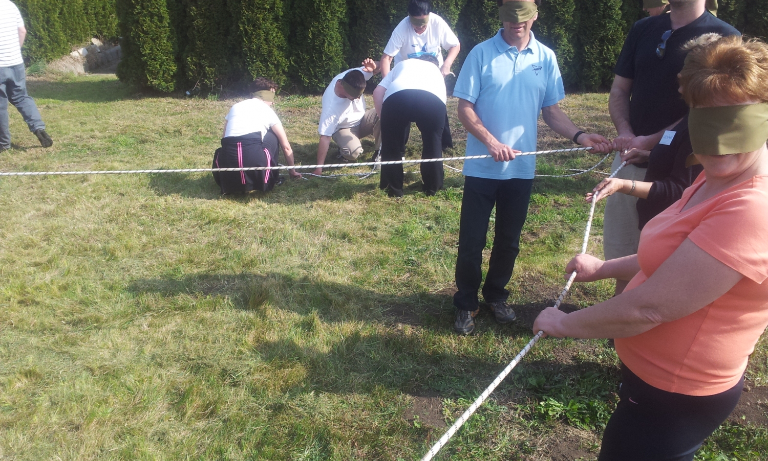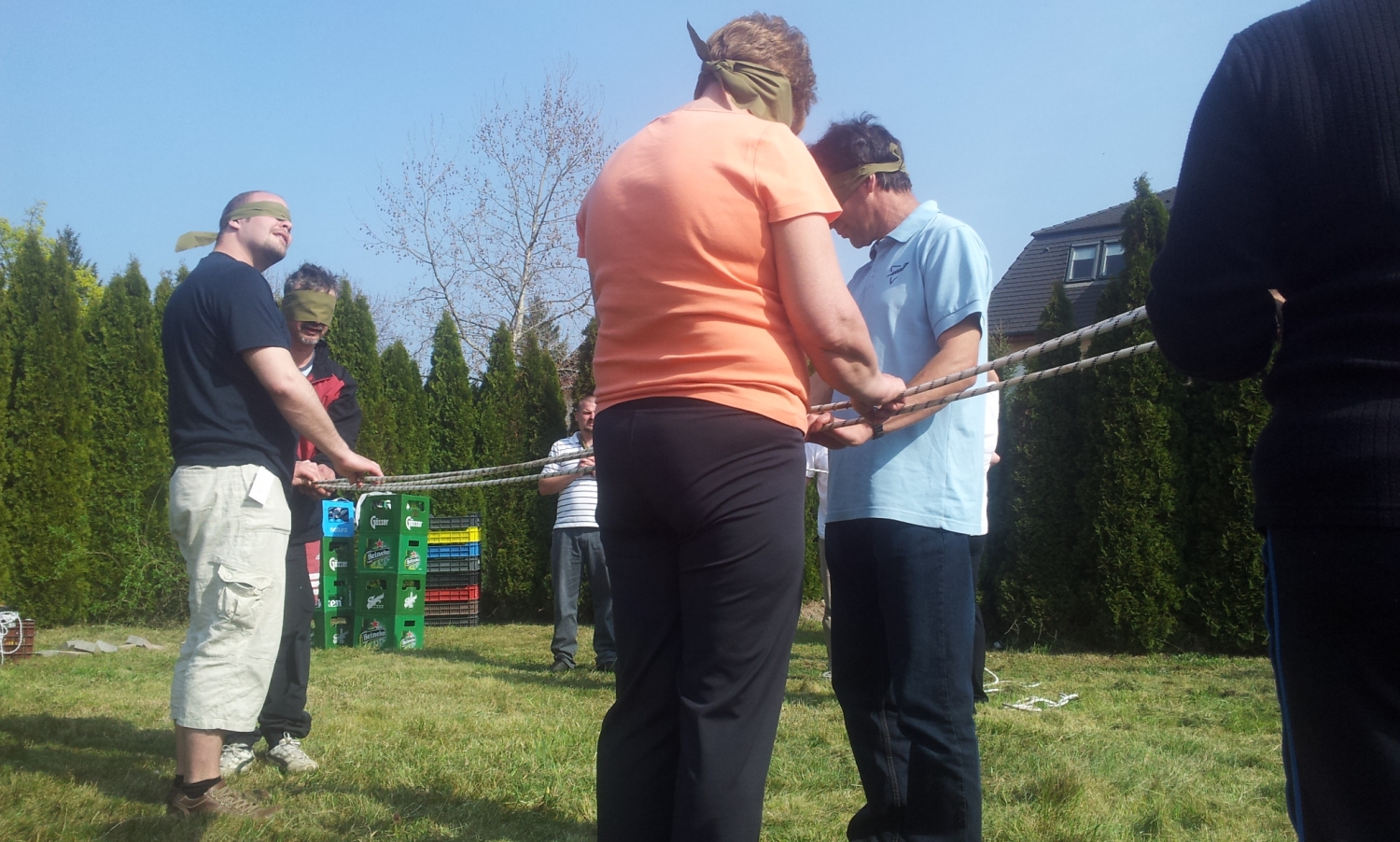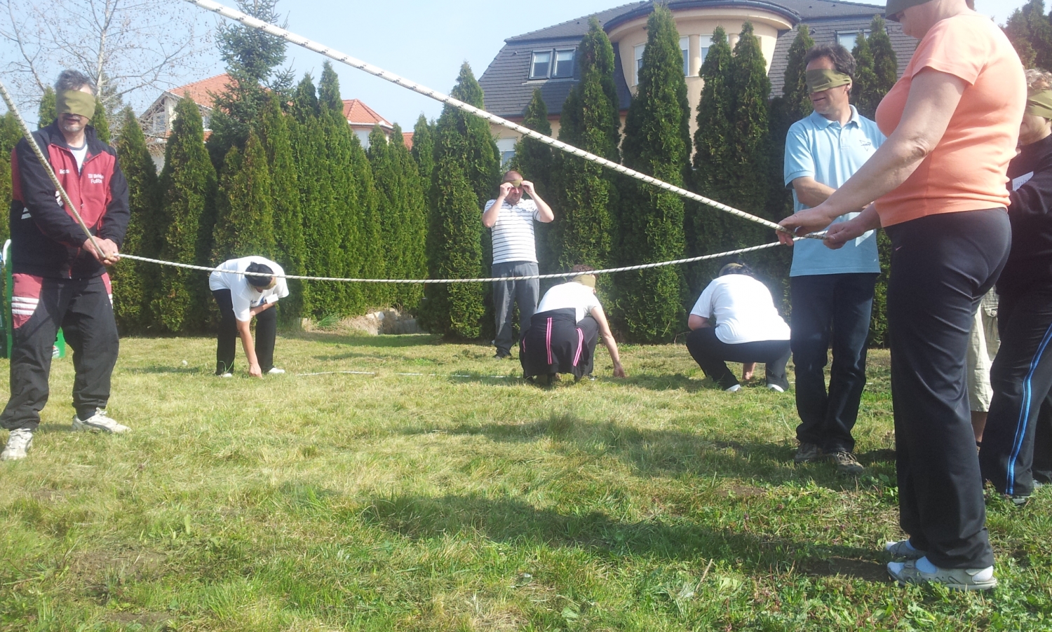 A játékosoknak bekötött szemmel kell egy egyenlő szárú háromszöget alkotniuk, az általunk adott kötélből, miközben mindenki fogja azt.